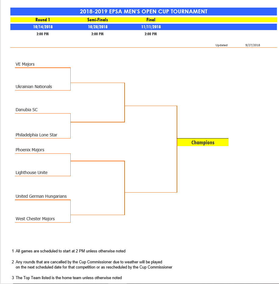 Here’s the full fixture list for both the 2018/19 EPSA Open Cup and Amateur Cup. VE Majors are the defending State Open Cup champions while West Chester Majors are the defending State Amateur Cup champions.